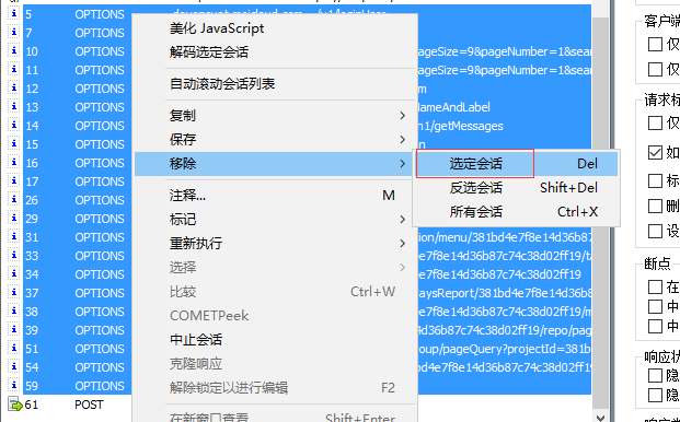 7. 然后单击选中option一项请求,按住shift键,在点击最下面一条option请求,实现全选,然后点击右键移除》选定会话