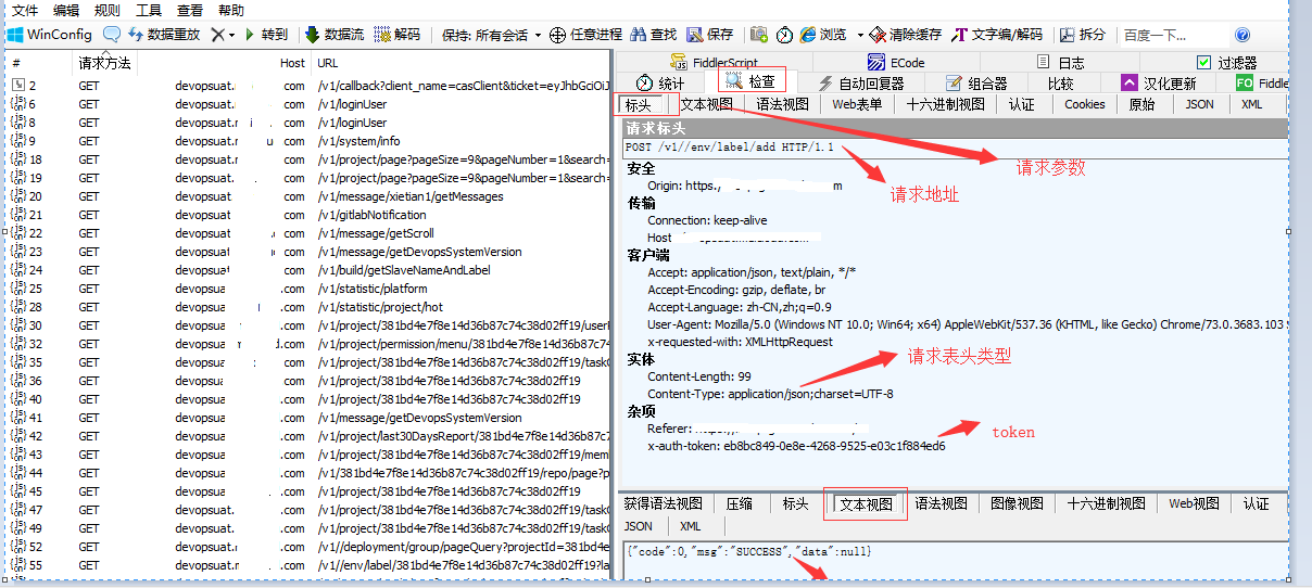 9. 击选中post请求,点击检查》标头查看接口请求地址、请求头、点击文本视图查看请求参数,点击右下表查看响应结果
