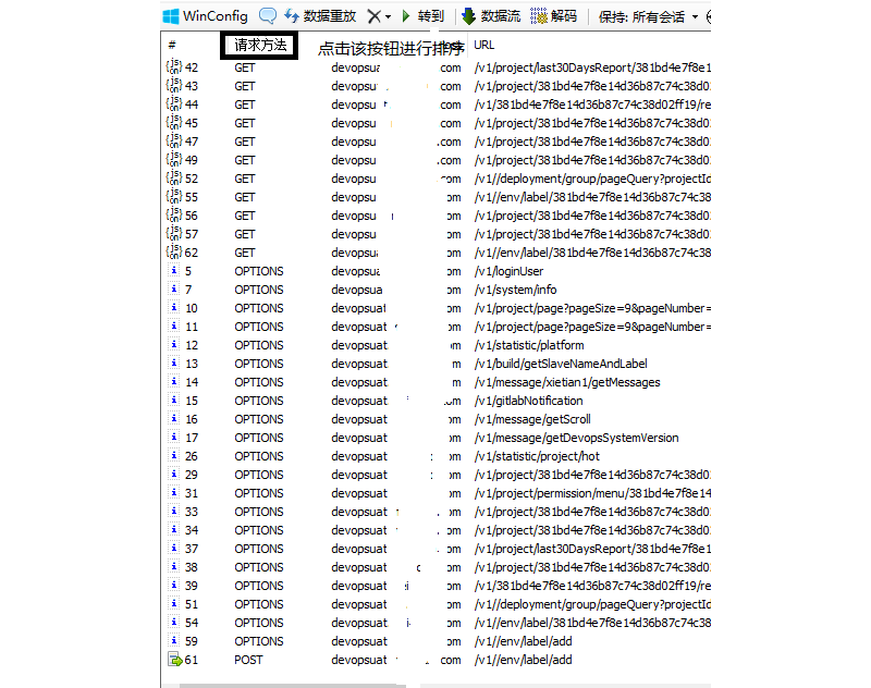 6. 图中包含了GET、POST、OPTIONS请求,可以手动点击请求方法进行排序,然后把不需要的请求移除