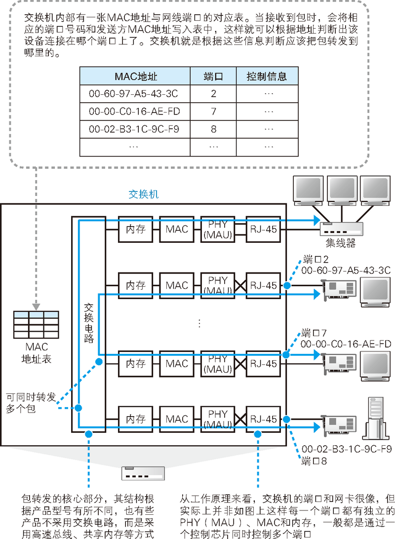 集线器是以太网的基本架构,它将信号原封不动地广播到所有连接在它上面的设备,然后由设备根据接收方的MAC地址来判断是否接收。