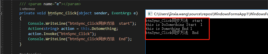 1 #region 委托调用Invoke 2 /// <summary> 3 /// 同步方法执行顺序依次是 4 /// button1_Click_同步方法 start 5 /// this is DoSomething Start 6 /// this is DoSomething End 7 /// button1_Click_同步方法 End 8 /// </summary> 9 /// <param name="sender"></param> 10 /// <param name="e"></param> 11 private void btnSync_Click(object sender, EventArgs e) 12 { 13 Console.WriteLine("btnSync_Click同步方法 start"); 14 Action<string> action = this.DoSomething; 15 action.Invoke("btnSync_Click"); //;利用委托调用Domething方法,这块实际上和直接调用Domething方法没什么区别 16 Console.WriteLine("btnSync_Click同步方法 End"); 17 } 18 19 #endregion