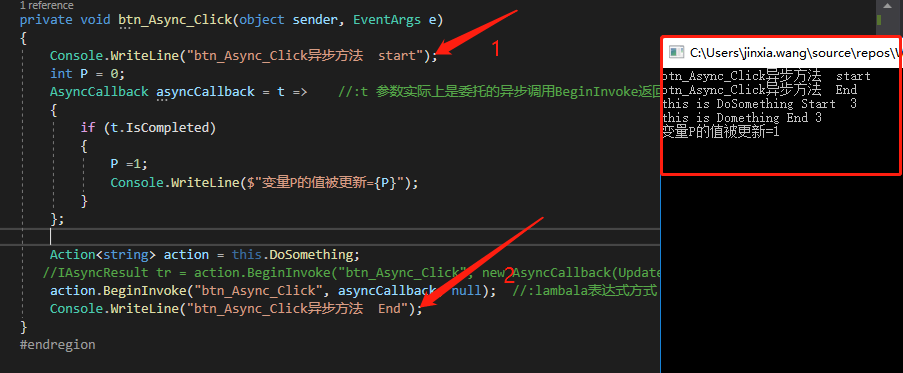 1 #region 委托的异步调用及回调BeginInvoke 2 /// <summary> 3 /// 1、异步方法执行顺序 4 /// 2、异步回调 5 /// </summary> 6 /// <param name="sender"></param> 7 /// <param name="e"></param> 8 9 private void btn_Async_Click(object sender, EventArgs e) 10 { 11 Console.WriteLine("btn_Async_Click异步方法 start"); 12 int P = 0; 13 AsyncCallback asyncCallback = t => //:t 参数实际上是委托的异步调用BeginInvoke返回的结果作为参数 14 { 15 Console.WriteLine("在这里处理异步执行完成之后需要完成的业务操作"); 16 if (t.IsCompleted) 17 { 18 P=1; 19 Console.WriteLine($"P={P}"); 20 } 21 }; 22 23 Action<string> action = this.DoSomething; 24 //IAsyncResult tr = action.BeginInvoke("btn_Async_Click", new AsyncCallback(UpdateInstanceP), null); 25 action.BeginInvoke("btn_Async_Click", asyncCallback, null); //:lambala表达式方式 26 Console.WriteLine("btn_Async_Click异步方法 End"); 27 } 28 #endregion