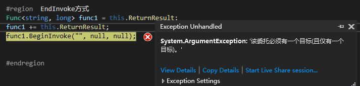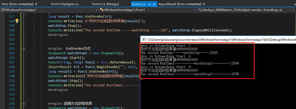 18 long result = func.EndInvoke(tr); 19 Console.WriteLine( $"异步方法返回的结果值{result}"); 20 watchStop.Stop(); 21 Console.WriteLine("The second RunTime------watchStop-----:{0}", watchStop.ElapsedMilliseconds); 22 #endregion 23 24 25 #region EndInvoke方式 26 Stopwatch watchStop1 = new Stopwatch(); 27 watchStop1.Start(); 28 Func<string, long> func1 = this.ReturnResult; 29 IAsyncResult tr1 = func1.BeginInvoke("", null, null); 30 long result1 = func1.EndInvoke(tr1); 31 Console.WriteLine($"异步方法返回的结果值{result1}"); 32 watchStop1.Stop(); 33 Console.WriteLine("The second RunTime1-----------watchStop1----------:{0}", watchStop1.ElapsedMilliseconds); 34 #endregion 35 36 37 #region 回调方式获取结果 38 Stopwatch watchStop2 = new Stopwatch(); 39 watchStop2.Start(); 40 AsyncCallback asyncCallback = t => 41 { 42 AsyncResult ar = (AsyncResult)t; 43 Func<string, long> del = (Func<string, long>)ar.AsyncDelegate; 44 //回调方法中调用了EndInvoke 45 long result3 = del.EndInvoke(t); 46 Console.WriteLine($"异步方法返回的结果值{result3}"); 47 watchStop2.Stop(); 48 Console.WriteLine("The second RunTime1-----------watchStop2----------:{0}", watchStop2.ElapsedMilliseconds); 49 }; 50 51 Func<string, long> func2 = this.ReturnResult; 52 IAsyncResult tr2 = func2.BeginInvoke("", asyncCallback, null); 53 #endregion 54 }