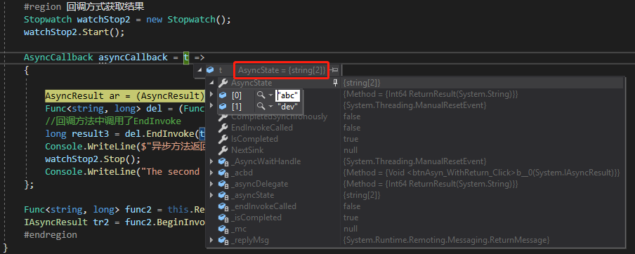 2、BeginInvoke 第三个参数,传递之后可以在回调函数 通过AsyncState属性获取,如下图所示。