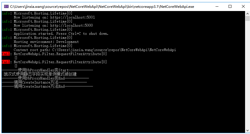 public void TestSingleton() { Console.WriteLine("--------使用DbProxyHandler类Start------------"); var s= DbProxyHandler.connStr; //:并没有调用CreateInstance方法,只是使用了DbProxyHandler类 Console.WriteLine("--------使用DbProxyHandler类End------------"); Console.WriteLine("------调用CreateInstance方法--------------"); DbProxyHandler dbProxyHandler1 = DbProxyHandler.CreateInstance(); //:调用CreateInstance方法 Console.WriteLine("------调用CreateInstance方法End--------------"); }
