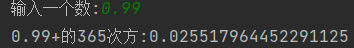 x = eval(input('输入一个数:')) y = x**365 print(f'{x}+的365次方:{y}')