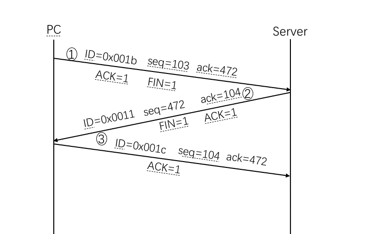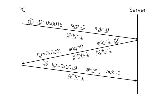 三次报文握手中PC先向Server端发送连接请求报文,让同步位SYN=1,此时需要选择一个初始序号(seq=x)seq=0,因为SYN报文段不能携带数据,但要消耗掉一个序号;Server端收到请求报文后,如果同意建立连接,则向PC端发送确认,确认报文段中,SYN=1,ACK=1,确认号ack=0+1(ack=x+1),此时需要选择一个初始序号(seq=y)seq=0,因为此报文段也不能携带数据,但要消耗掉一个序号;PC端收到Server端的确认后,需要再给Server端发送确认,其中,ACK=1,确认号ack=0+1(ack=y+1),seq=0+1(seq=x+1),因为ACK报文段可以携带数据,所以如果携带了数据就要消耗掉一个序号,若没有携带数据则下一数据报文段的序号仍然是seq=1(seq=x+1)。