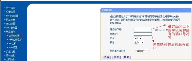 (2)以上步骤还不能保证外部网路能访问你的机器。因为在你的办公室里不光是有你的电脑,还有同事的,在外部看来你们使用的同一IP,那怎样让外部访问到你的机器呢?这就涉及到路由的端口映射。办法很简单,在左边的“转发规则|虚拟服务器”中对你需要映射的电脑的IP映射,如下图:
