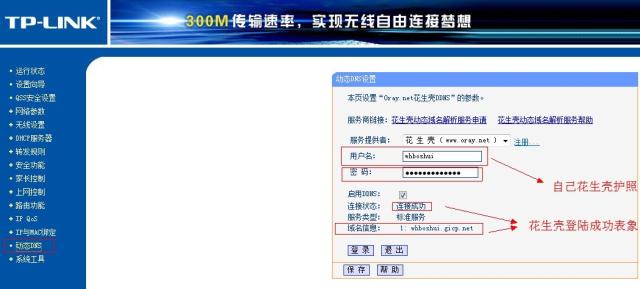 点击左边的“动态DNS”,在其设置中进行如下设置:把你申请的花生壳护照和密码对账户进行登陆,而且要勾选“启用DDNS”,登陆成功后,会显示连接状态“连接成功”,域名信息为该护照下的域名。