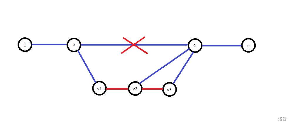 进一步发现只有 \(1\) 到 \(n\) 上的路径被删才可以产生新的解,所以只对 \(1\) 到 \(n\) 的边建线段树。继续考虑如何计算贡献:对不在路径上的每一个点计算其在路径上最左、最右的点 \(l_i\) 和 \(r_i\)。对于所有满足 \(l_u < r_v\) 非树边 \((u,v)\),其可以更新的边是 \(l_u\) 到 \(r_v\) 的路径,证明是简单的。