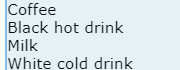 <dl> <dt>Coffee</dt> <dd>Black hot drink</dd> <dt>Milk</dt> <dd>White cold drink</dd> </dl>
