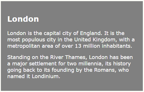 <!DOCTYPE html> <html> <head> <style> .cities { background-color:black; color:white; margin:20px; padding:20px; } </style> </head> <body> <div class="cities"> <h2>London</h2> <p> London is the capital city of England. It is the most populous city in the United Kingdom, with a metropolitan area of over 13 million inhabitants. </p> </div> </body> </html>