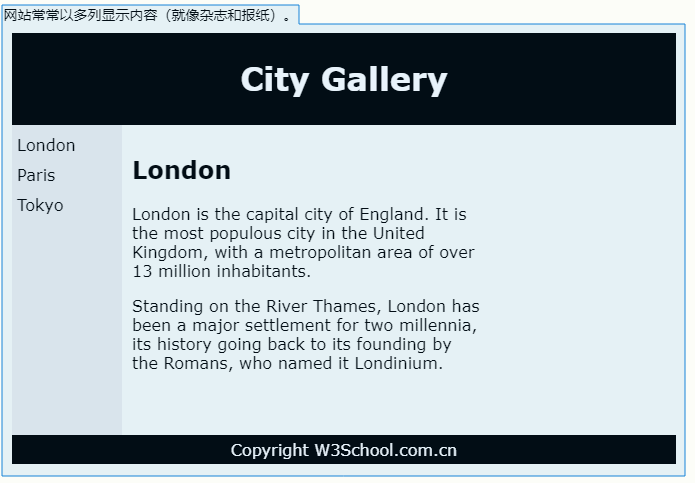 <body> <div id="header"> <h1>City Gallery</h1> </div> <div id="nav"> London<br> Paris<br> Tokyo<br> </div> <div id="section"> <h1>London</h1> <p> London is the capital city of England. It is the most populous city in the United Kingdom, with a metropolitan area of over 13 million inhabitants. </p> <p> Standing on the River Thames, London has been a major settlement for two millennia, its history going back to its founding by the Romans, who named it Londinium. </p> </div> <div id="footer"> Copyright W3School.com.cn </div> </body>