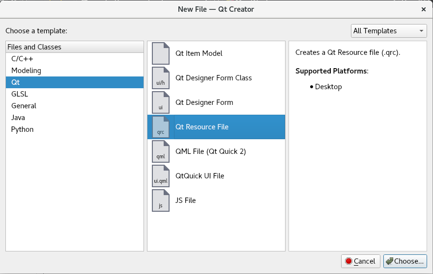 Qt 资源系统是一个跨平台的资源机制,用于将程序运行时所需要的资源以二进制的形式存储于可执行文件内部。如果你的程序需要加载特定的资源(图标、文本翻译等),那么,将其放置在资源文件中,就再也不需要担心这些文件的丢失。也就是说,如果你将资源以资源文件形式存储,它是会编译到可执行文件内部。使用 Qt Creator 可以很方便地创建资源文件。我们可以在工程上点右键,选择“添加新文件…”,可以在 Qt 分类下找到“Qt 资源文件”: