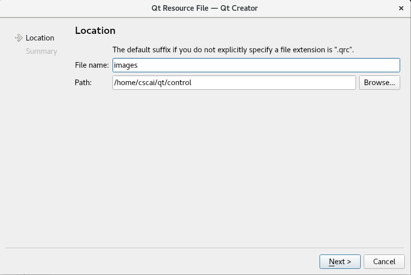 点击“Choose…”按钮,打开“新建 Qt 资源文件”对话框。在这里我们输入资源文件的名字和路径: