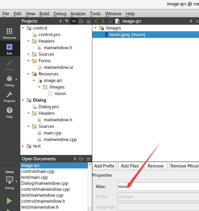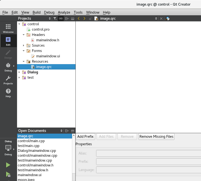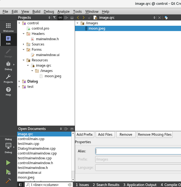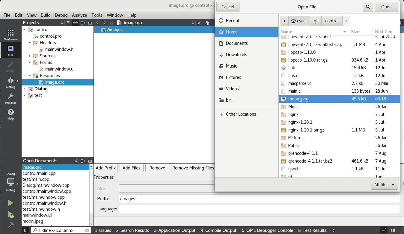 接下来需要添加前缀,比如我们将前缀取名为 images。然后选中这个前缀,继续点击添加文件,可以找到我们所需添加的文件。这里,我们选择 moon.jpeg 文件。当我们完成操作之后,Qt Creator 应该是这样子的: