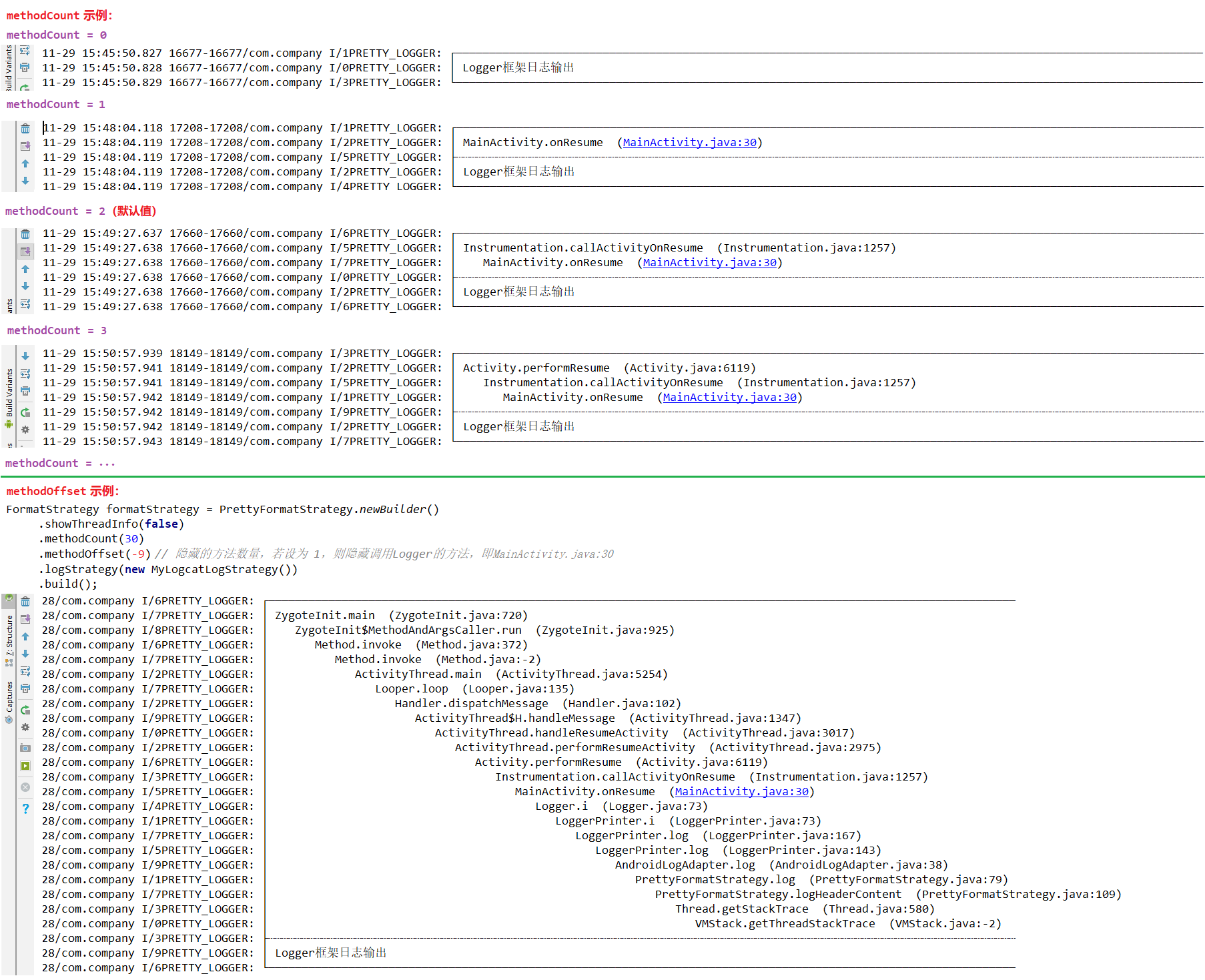 FormatStrategy formatStrategy = PrettyFormatStrategy.newBuilder() .showThreadInfo(true) // (可选) 是否显示线程信息。Default:true .methodCount(1) // (可选) 显示的方法数量。Default:2 .methodOffset(0) // (可选) 隐藏的方法数量,若设为 1,则隐藏跳转到日志输出的方法。Default:0 // .logStrategy(customLog) // (可选) 更改日志策略以打印输出。Default:new LogcatLogStrategy()。AS3.0会出现日志无法对齐的问题,解决方法见下文。 // .tag("My custom tag") // (可选) 每个日志的全局标记. Default:PRETTY_LOGGER .build(); Logger.addLogAdapter(new AndroidLogAdapter(formatStrategy){ // 日志适配器通过检查此函数来检查日志是否应该打印。如果要禁用/隐藏输出日志,请重写isLoggable方法。true将打印日志消息,false会忽略它。 @Override public boolean isLoggable(int priority, String tag) { return BuildConfig.DEBUG; } });