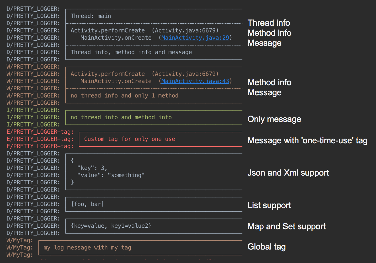 Logger.addLogAdapter(new AndroidLogAdapter());