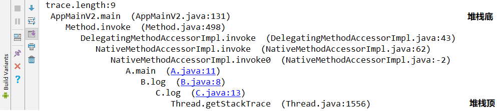 public class A { public static void main(String[] args) { B b = new B(); b.log(); } } class B { public void log() { C c = new C(); c.log(); } } class C { private int MIN_STACK_OFFSET = 1; private int methodCount = 2; public void log() { StringBuilder builder; // 第一个元素代表堆栈顶,它是该序列中最新的方法调用。最后一个元素代表堆栈底,是该序列中最旧的方法调用。 StackTraceElement[] trace = Thread.currentThread().getStackTrace(); System.out.println("trace.length:" + trace.length); // 用来缩进 String level = ""; int stackOffset = getStackOffset(trace); for (int i = trace.length - 1; i >= 0; i--) { builder = new StringBuilder(); StackTraceElement e = trace[i]; builder.append(' ') .append(level) .append(getSimpleClassName(e.getClassName())) .append(".") .append(e.getMethodName()) .append(" ") .append(" (") .append(e.getFileName()) .append(":") .append(e.getLineNumber()) .append(")"); level += " "; System.out.println(builder.toString()); } } private static String getSimpleClassName(@NonNull String name) { int lastIndex = name.lastIndexOf("."); return name.substring(lastIndex + 1); } }