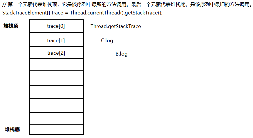 // 第一个元素代表堆栈顶,它是该序列中最新的方法调用。最后一个元素代表堆栈底,是该序列中最旧的方法调用。 StackTraceElement[] trace = Thread.currentThread().getStackTrace();