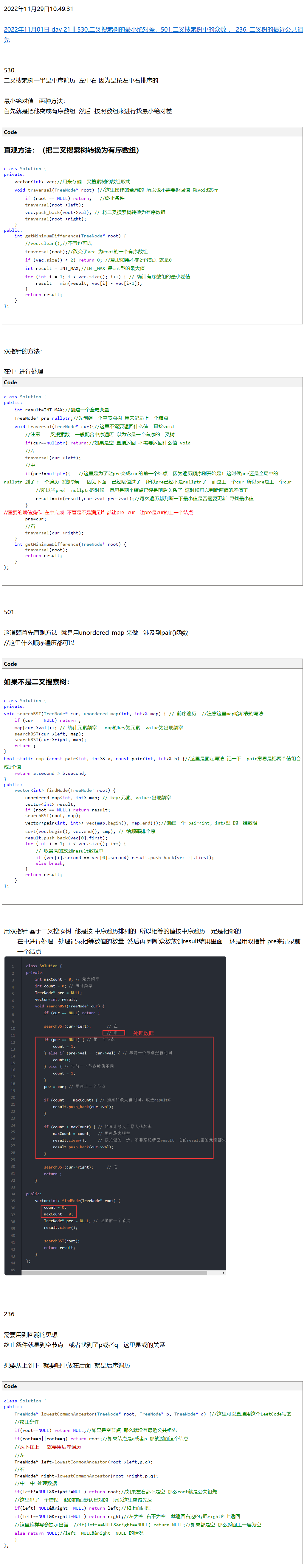 【onenote笔记迁移||C++学习】2022年11月29日 复习 Day 21 || 530.二叉搜索树的最小绝对差,501.二叉搜索树中的众数 , 236. 二叉树的最近公共祖先