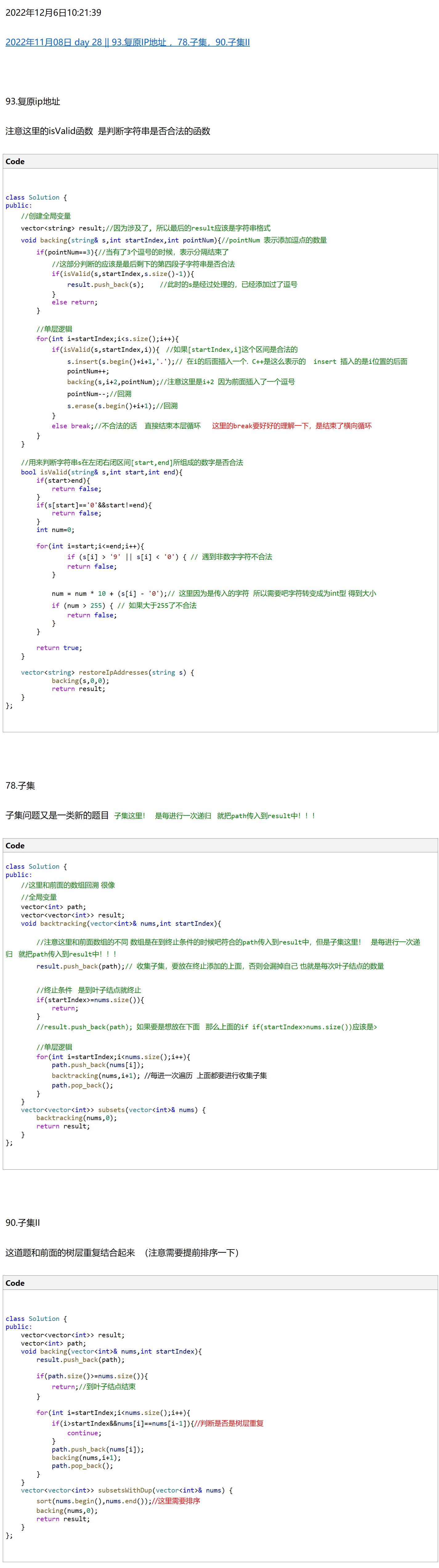 【onenote笔记迁移||C++学习】2022年12月06日 复习 Day 28 || 93.复原IP地址 ,78.子集,90.子集II