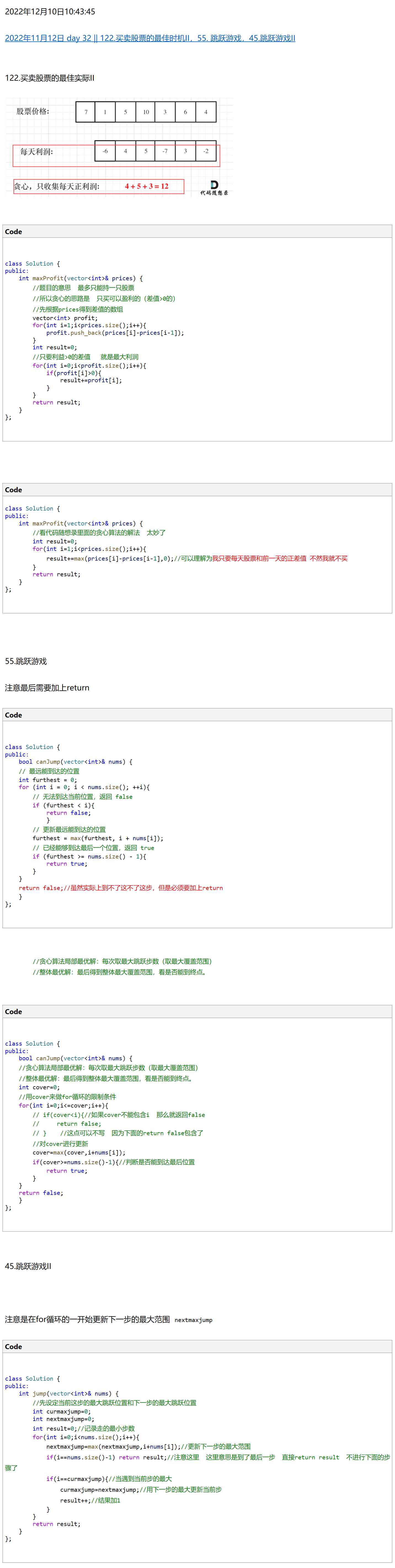 【onenote笔记迁移||C++学习】2022年12月10日 复习 Day 32 || 122.买卖股票的最佳时机II,55. 跳跃游戏,45.跳跃游戏II