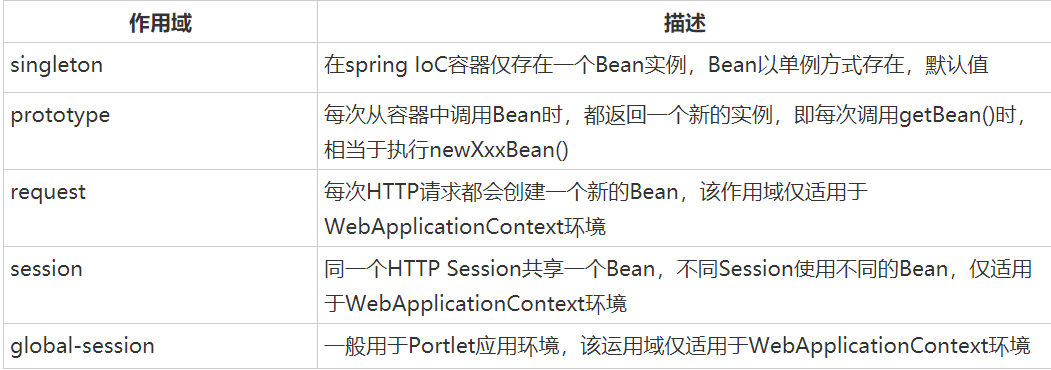 - global-session: 全局session作用域,仅仅在基于portlet的web应用中才有意义,Spring5已经没有了。Portlet是能够生成语义代码(例如:HTML)片段的小型Java Web插件。它们基于portlet容器,可以像servlet一样处理HTTP请求。但是,与 servlet 不同,每个 portlet 都有不同的会话
