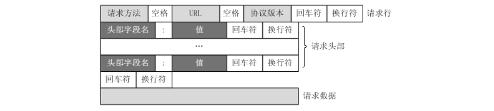 通过TCP套接字,客户端向Web服务器发送一个文本的请求报文,一个请求报文由请求行、请求头部、空行和请求数据4部分组成。 -
