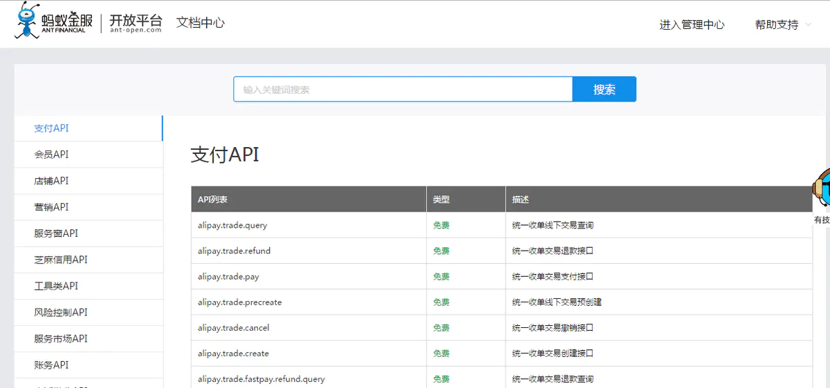 网址:https://doc.open.alipay.com/doc2/apiList?docType=4