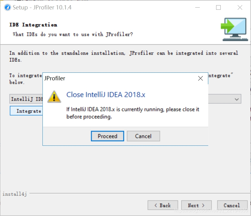 这里是让你选择集成的工具。我这里是idea2018.x版本的。所以我这样选择的。然后点击integrate会出现提示框。这个时候需要把idea给关闭掉才行。