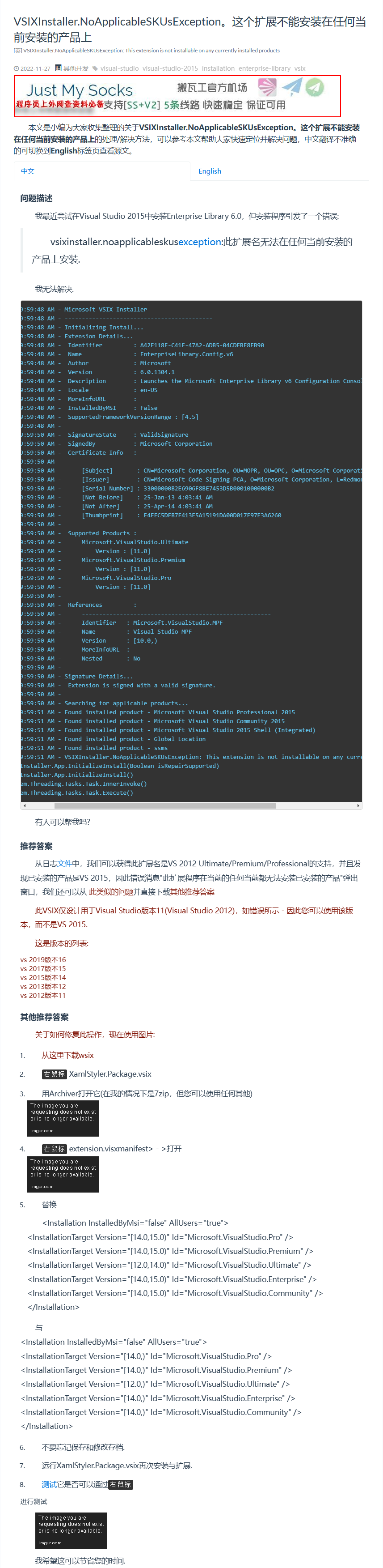 VisualStudio此扩展不能安装在任何当前安装的产品上/无法安装此扩展因为缺少以下引用(完美解决)