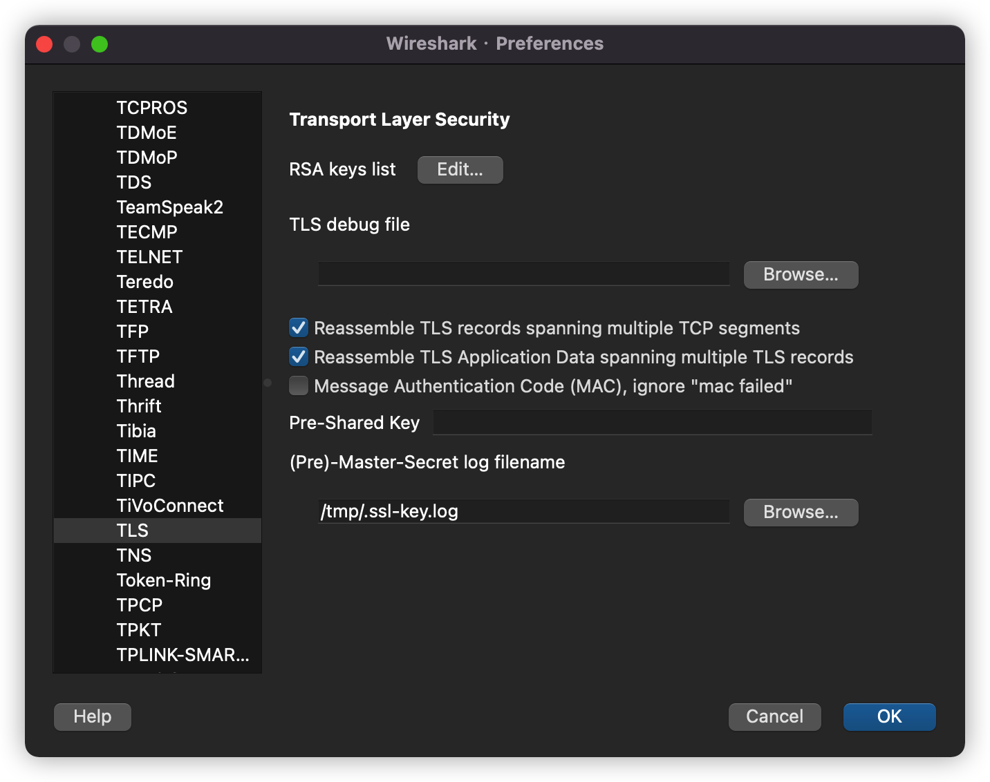 ssl-key-log-file=/tmp/.ssl-key.log/Applications/Google\ Chrome.app/Contents/MacOS/Google\ Chrome --user-data-dir=/tmp/chrome --ssl-key-log-file=/tmp/.ssl-key.log - 配置Wireshark,依次打开