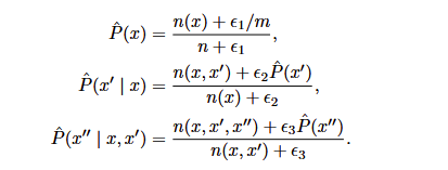上公式中分子为deep learning单词出现的次数,分母为deep单词出现的次数。不过有时一些不常见的单词组合可能只会在数据集中出现二三次,或者数据集过小,