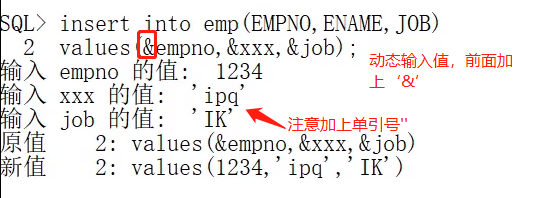 动态输入插入数据:表名、字段名、值 前都可以加&来动态输入值
