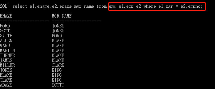 查找员工的经理的名字:select e1.ename,e2.ename mgr_name from emp e1,emp e2 where e1.mgr = e2.empno;