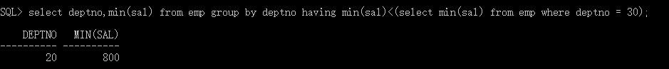 select deptno,min(sal) from emp group by deptno having min(sal)<(select min(sal) from emp where deptno = 30);