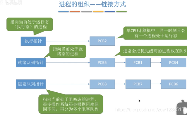 2.进程的组织:在一个系统中,通常有数十、数百乃至数千个PCB。为了能对他们加以有效的管理,应该用适当的方式把这些PCB组织起来。