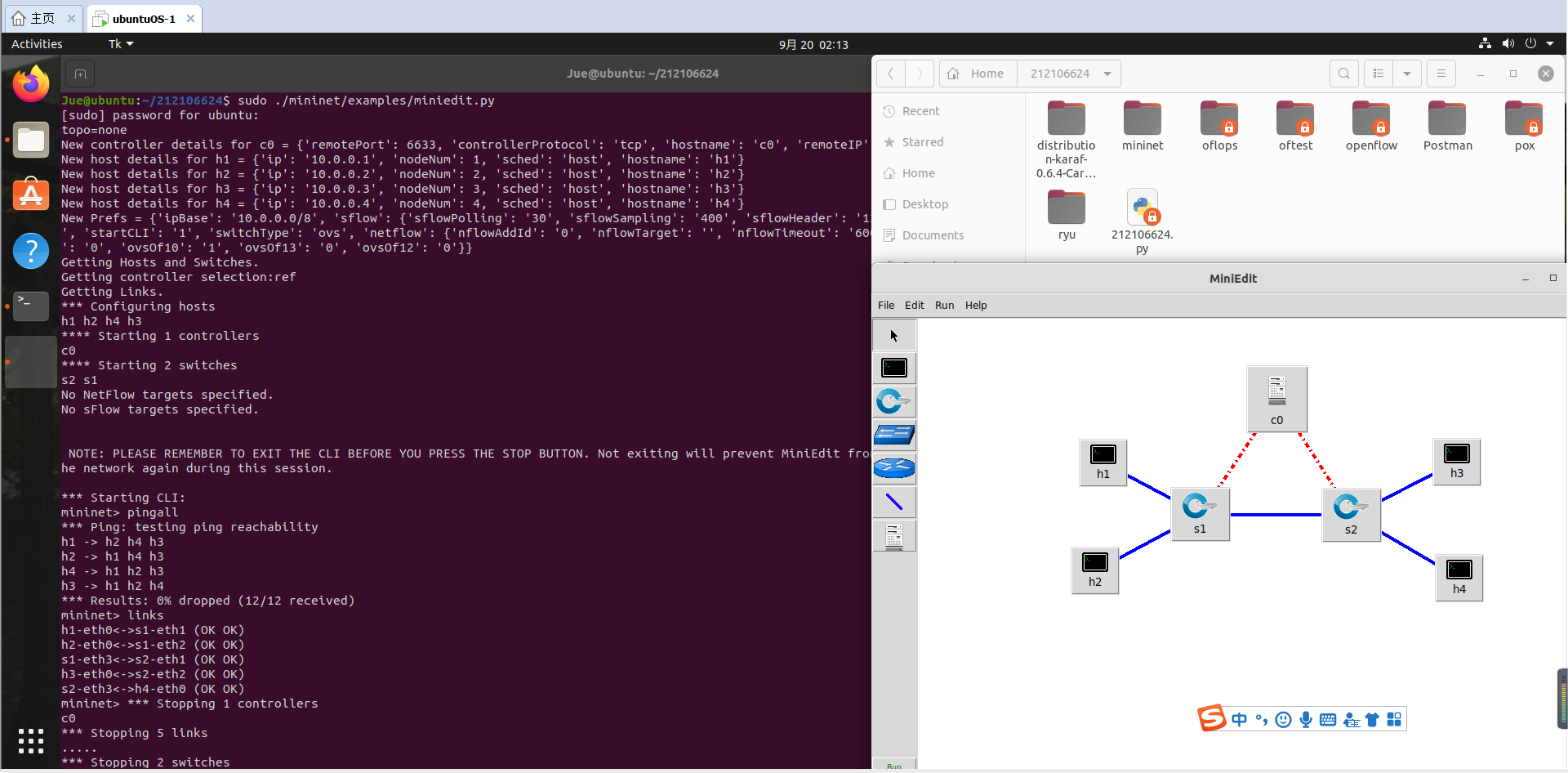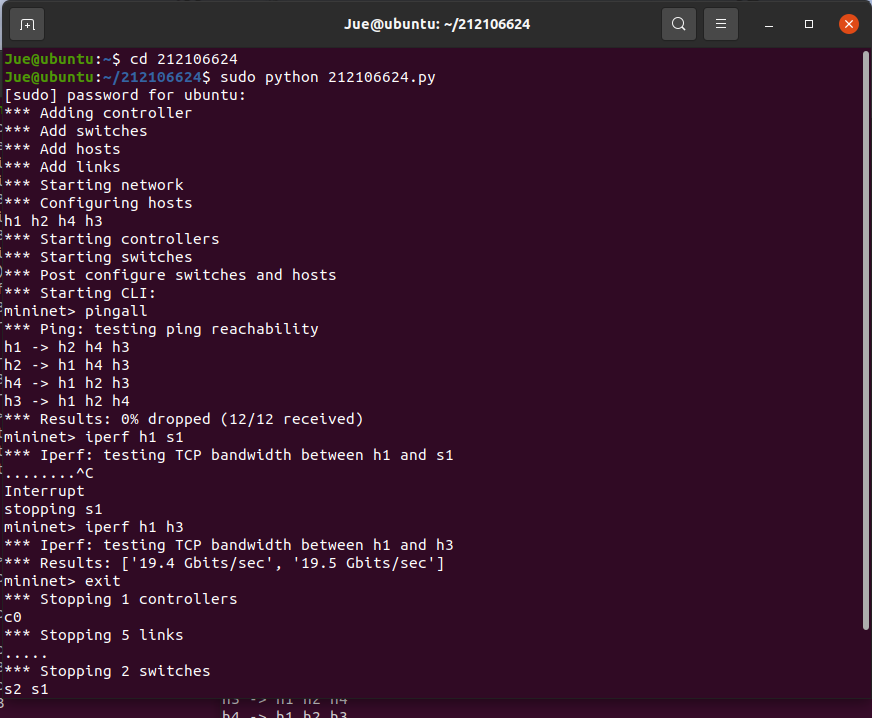 - c) 第3步提交修改过的“学号.py”代码、Mininet运行结果