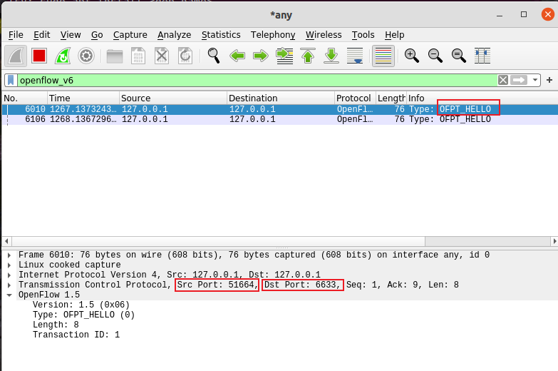 也有源端口51664 -> 目的端口6633的,即交换机到控制器的另一个包,此处协议为openflow1.5