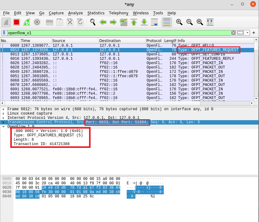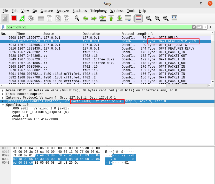 - OFPT_FEATURES_REQUEST, 源端口6633 -> 目的端口51664,从控制器到交换机,请求特征信息