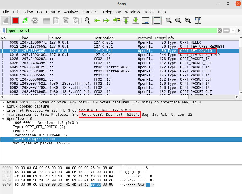 - OFPT_SET_CONFIG, 源端口6633(请按照我给你的flag和max bytes of packet进行配置) -> 目的端口51664,从控制器到交换机