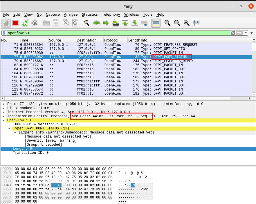 - OFPT_PORT_STATUS, 源端口44812 -> 目的端口6633,从交换机到控制器,交换机端口发生变化,告知控制器相应的端口状态。