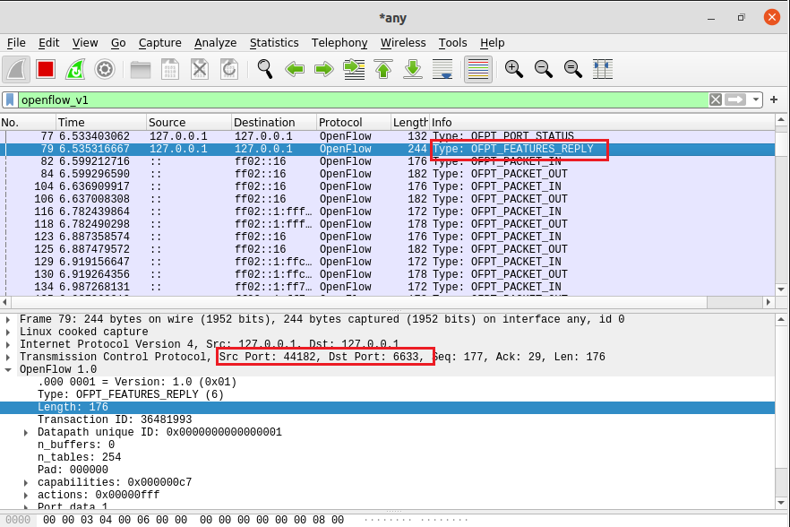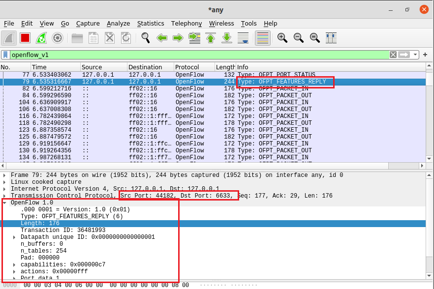 - OFPT_FEATURES_REPLY, 源端口44812 -> 目的端口6633,从交换机到控制器,(发送的特征信息,请查收)