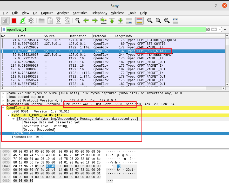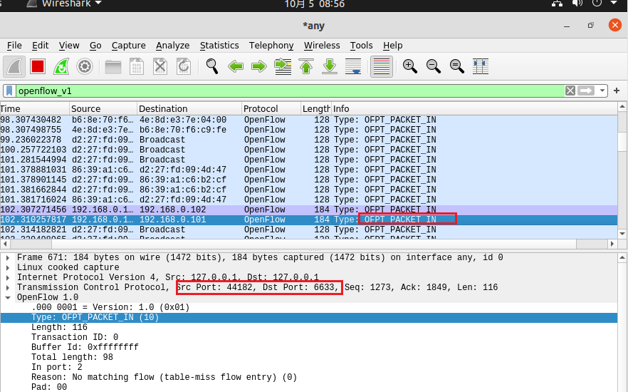 - OFPT_PACKET_IN, 源端口44182 -> 目的端口6633,从交换机到控制器