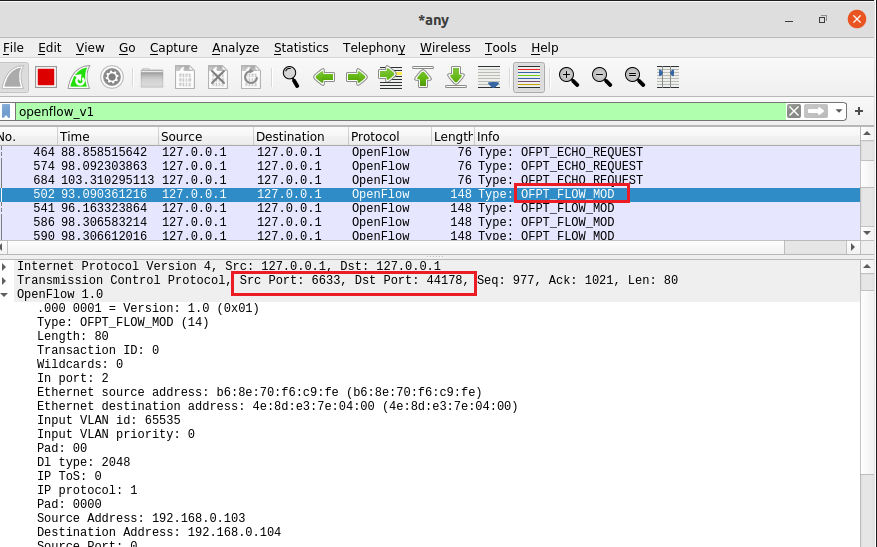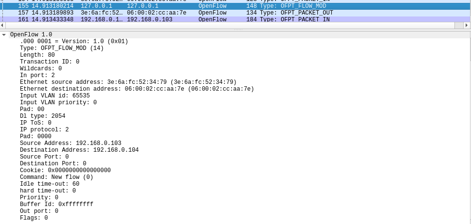 - OFPT_PACKET_MOD, 源端口6633 -> 目的端口44178,分析抓取的flow_mod数据包,控制器通过6633端口向交换机44178端口下发流表项,指导数据的转发处理