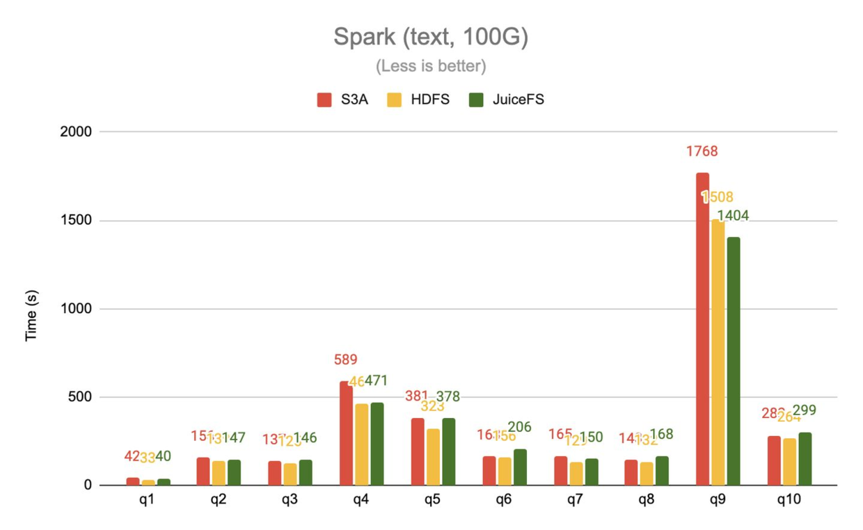 对于建表和修复表分区这样的操作,因为依赖对底层元数据的频繁访问(例如遍历目录),JuiceFS 的性能大幅领先于 S3A,最多有 60 倍的性能提升。
