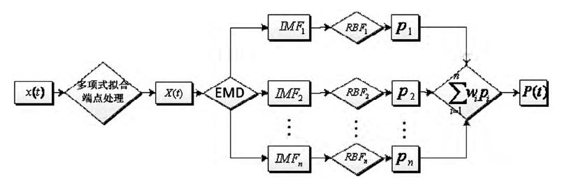 c. 使用EMD方法结合RBF(径向基函数)神经网络,搭建混合模型,对沪深300股指期货(2012-2014)日结算价数据进行训练和预测。就误差检测而言,结果优于传统GARCH、ARIMA模型。其中,在进行EMD运算之前,对原数据端点用多项式拟合算法做了处理,防止原序列极值端点出现发散现象并“污染”整个结果[5]。