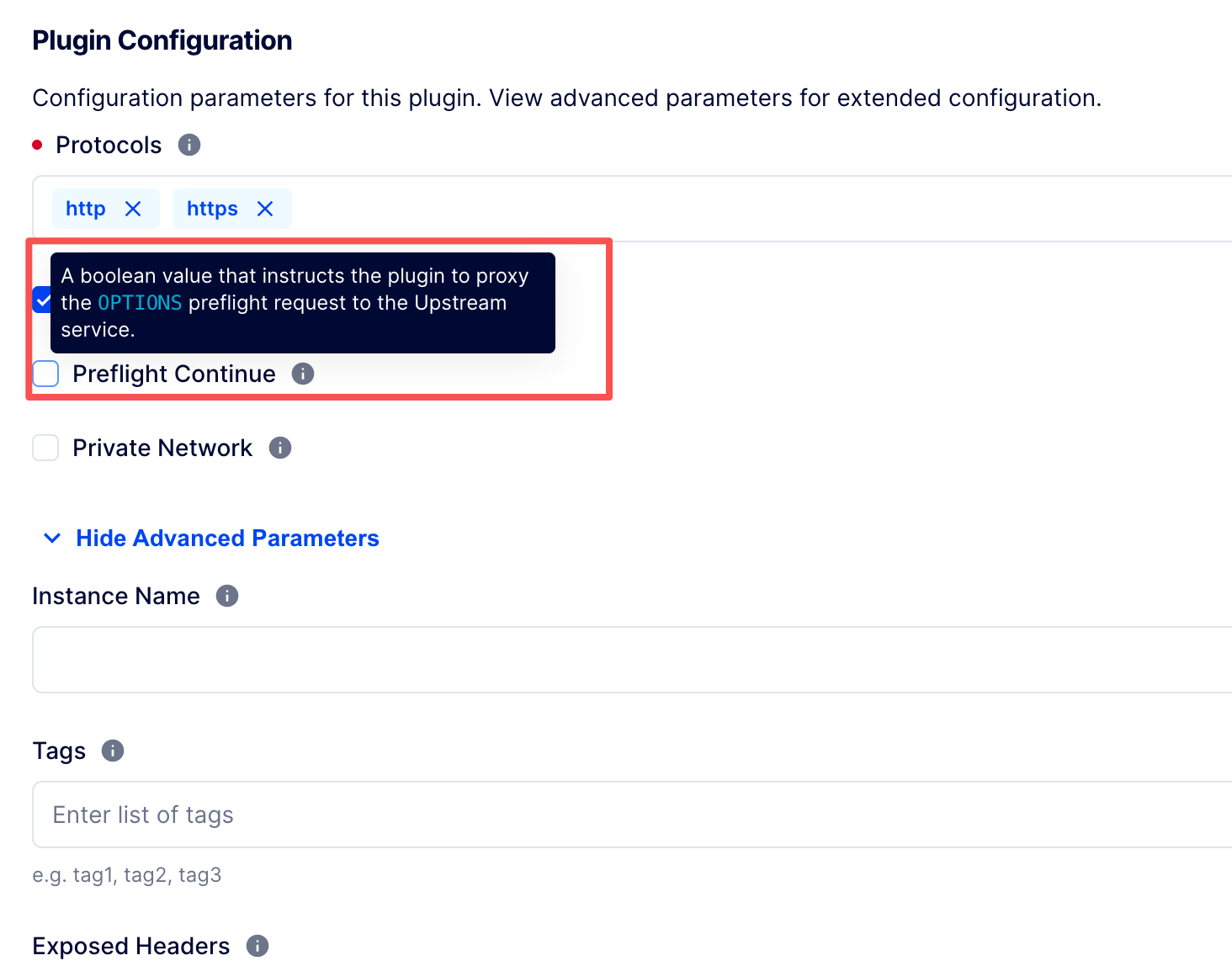 默认preflight_continue = false, 意味着插件不将预检请求转发给upstream,所以此处保持默认就好, 网关会根据请求特征和CORS配置产生CORS响应头,并返回你期待的200 OK响应码。