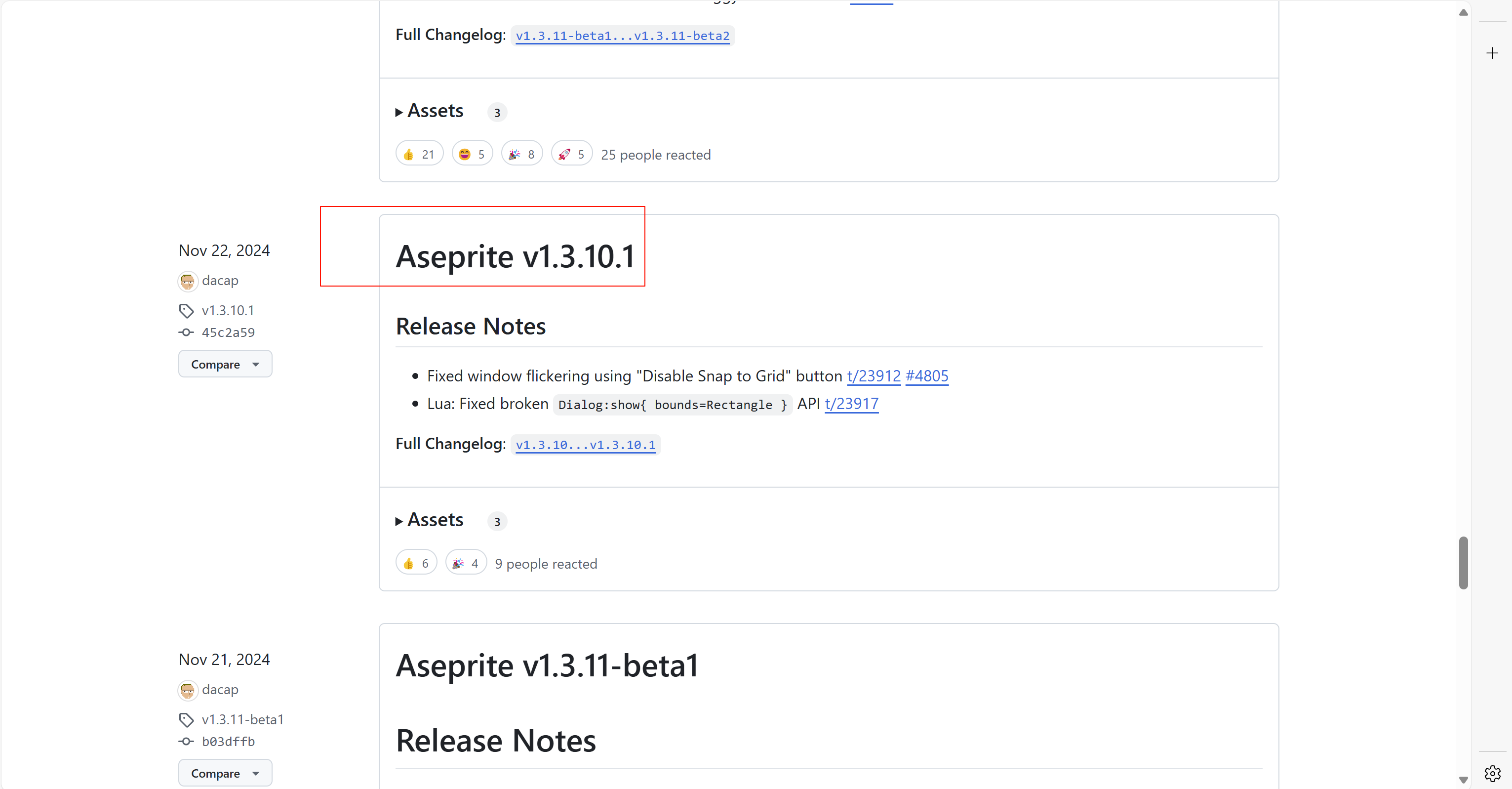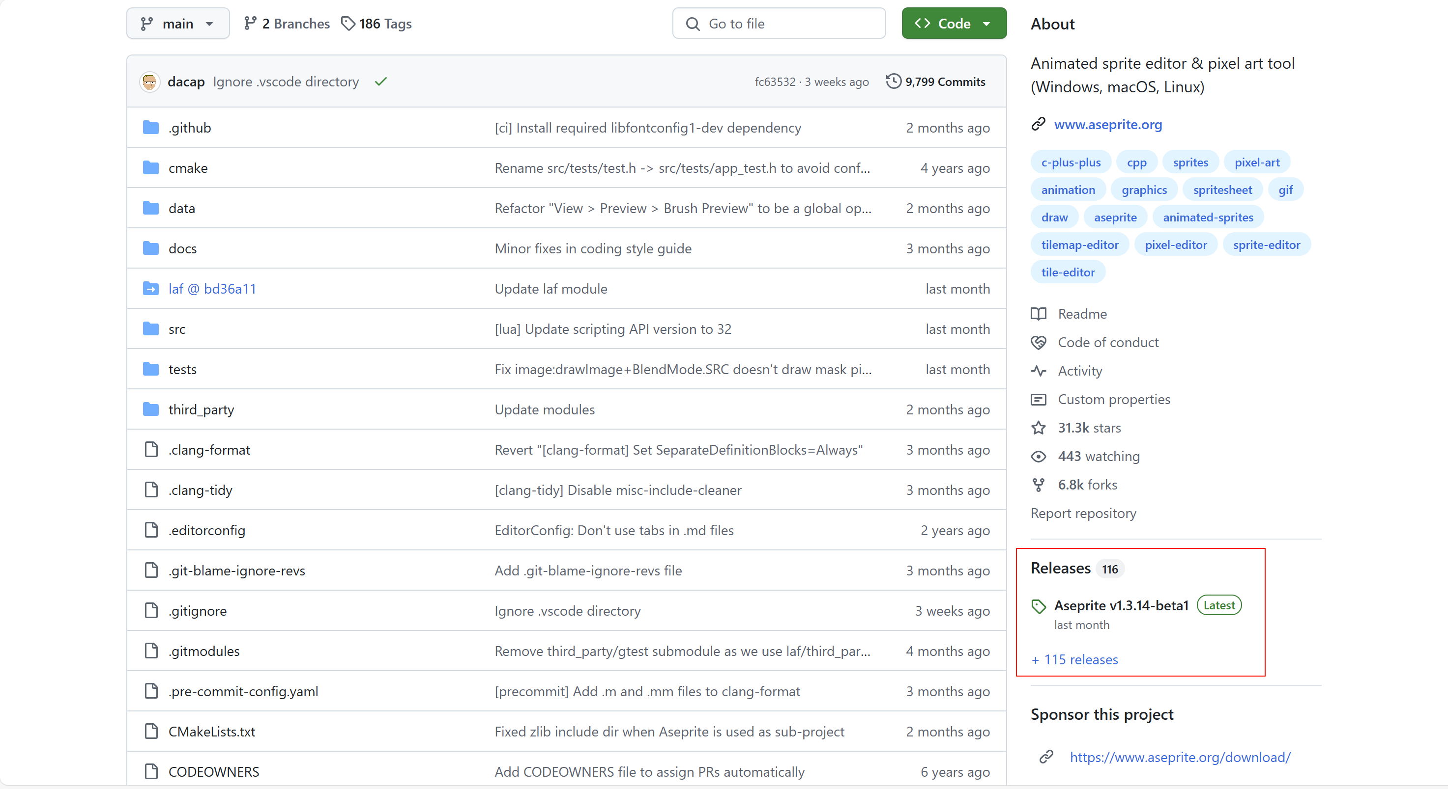 从可以从Aseprite官网最下面Development - GitHub找到链接,点击右侧Releases,选择一个版本进行下载。